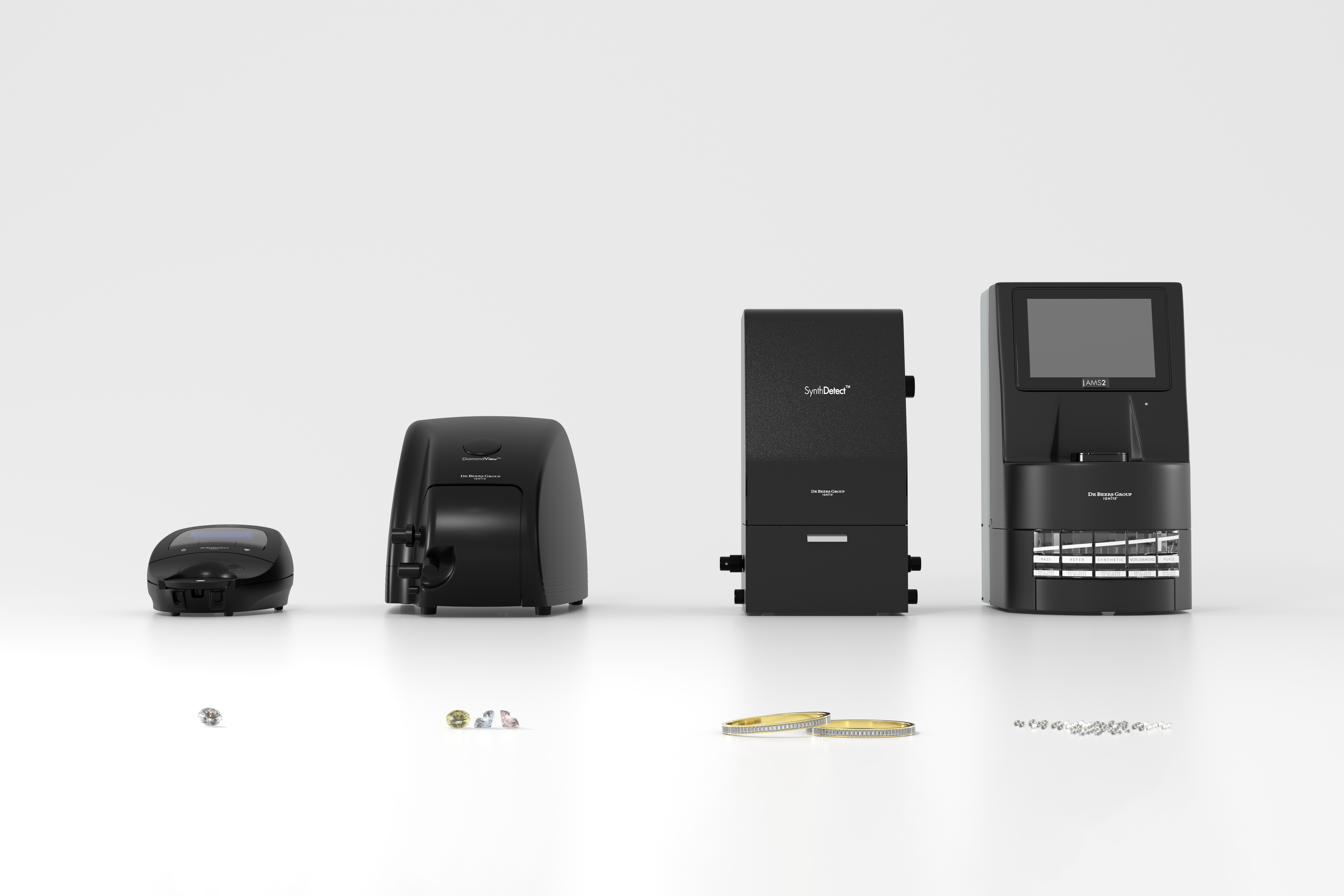 In the field of identification science and technology, DiamondSure is first employed by DBIoD to measure the light absorption of diamonds, effectively excluding all simulants and most non-natural diamonds (primary identification). For the small number of diamonds that cannot be identified by DiamondSure, DiamondView is used for a secondary identification process, in which high-power ultraviolet light is used to scan diamonds and identify natural diamonds (second identification). If the second identification is unsuccessful in determining whether the diamond is natural or not, the diamond will be sent to professional physicists for further analysis (tertiary identification). The physicists will study the light absorption characteristics of the diamond using spectroscopy and advanced instruments to strive for accurate and reliable final identification results.